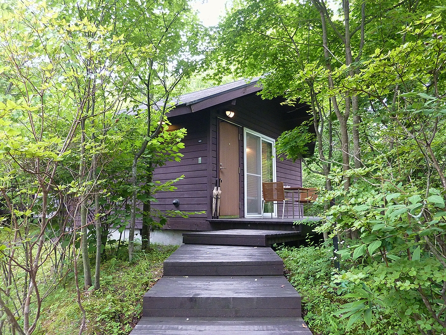 見えてきました。テラスヴィラというお部屋です。緑の中のコテージ風。
