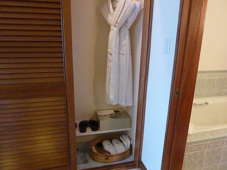 クローゼットは引き戸になっていて、貴重品BOXやスリッパ、バスローブなどが。