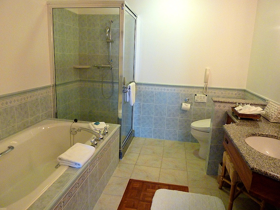 画像だと分かりづらいのですが、バスタブ左の壁から、シャワーブースの上の角まで