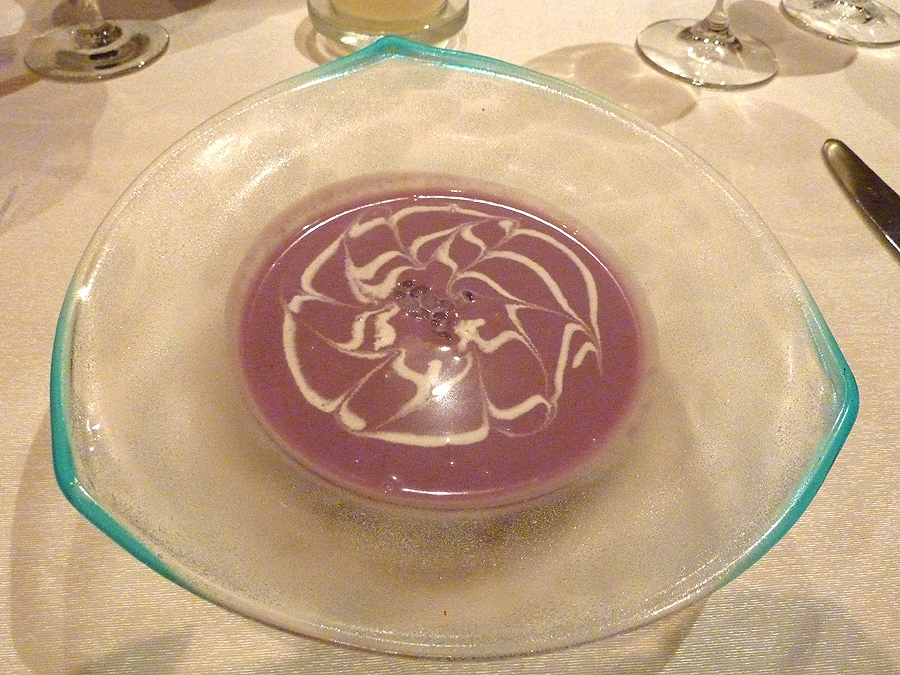 これはハイビスカスをイメージした、紅芋の冷製ポタージュです。