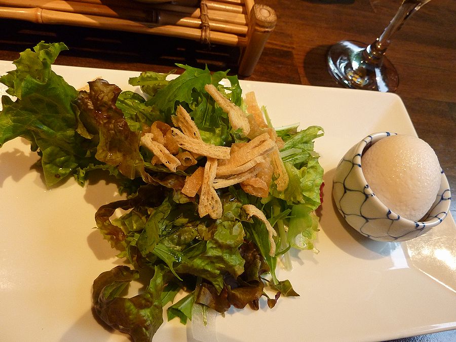 グリーンサラダですが、添えてある温泉卵を崩して乗せて