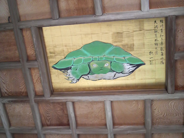 お賽銭箱の上で亀が睨んでた