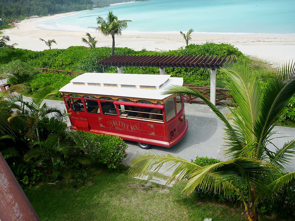 真っ赤な車体が南国の青い海と緑の木々に映えてます。