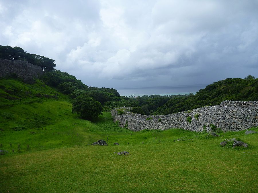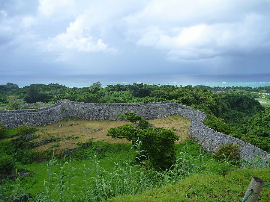 でもこの景色!緑の中の城跡、遠くに蒼い美ら海。