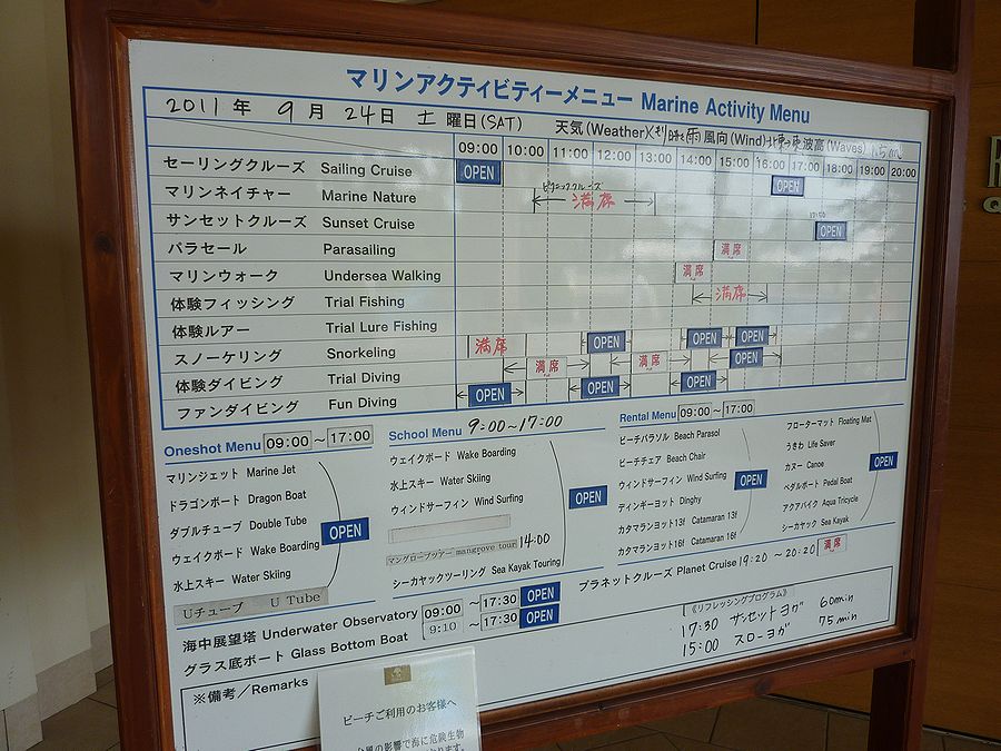 本日のマリンアクティビティカウンター前のスケジュールボード。