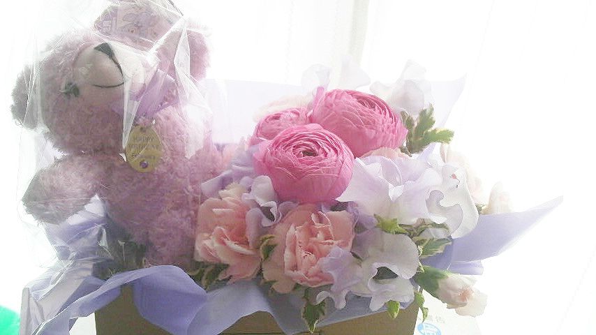 かわいいクマさん付きのアレンジメントです。